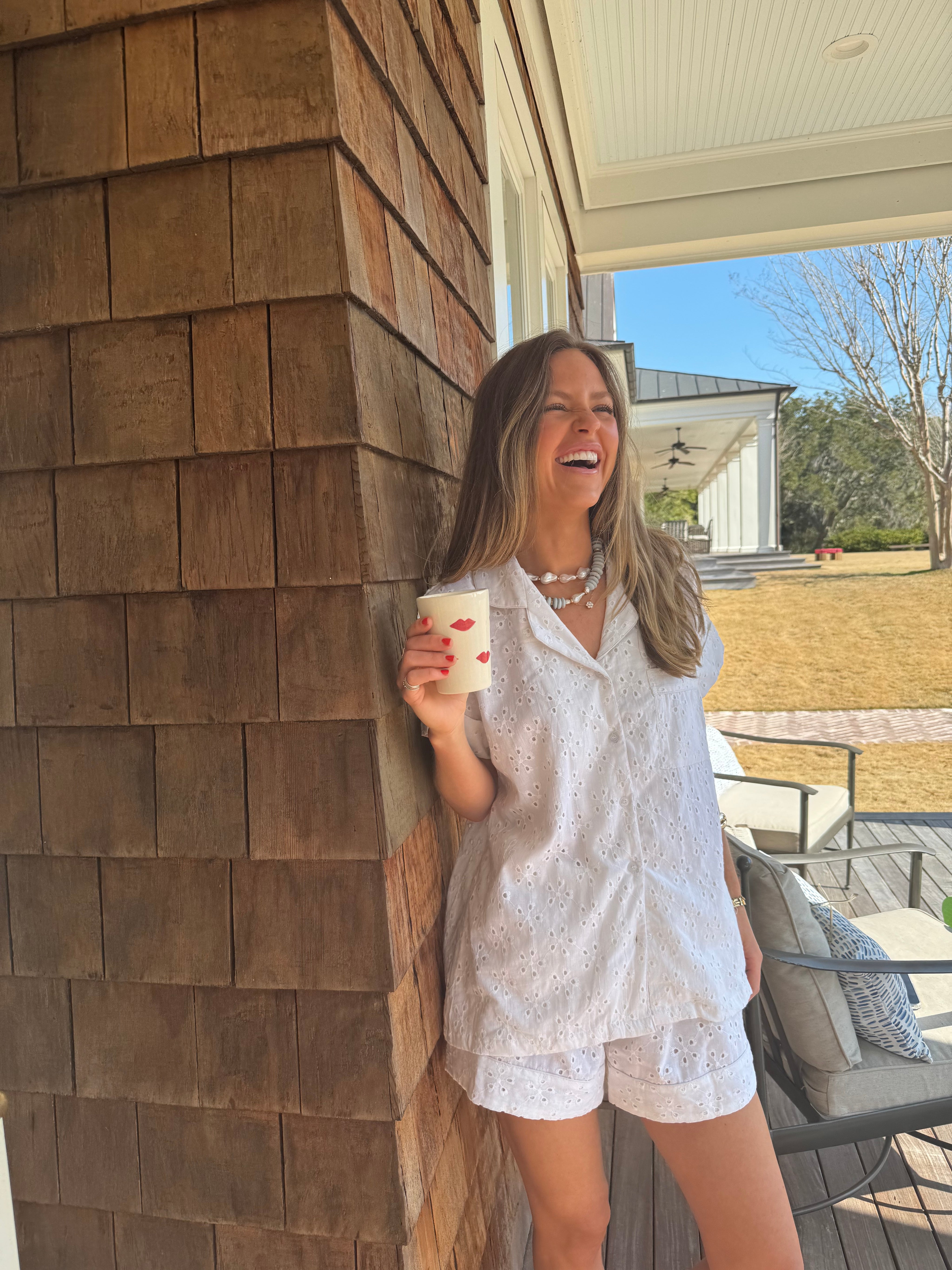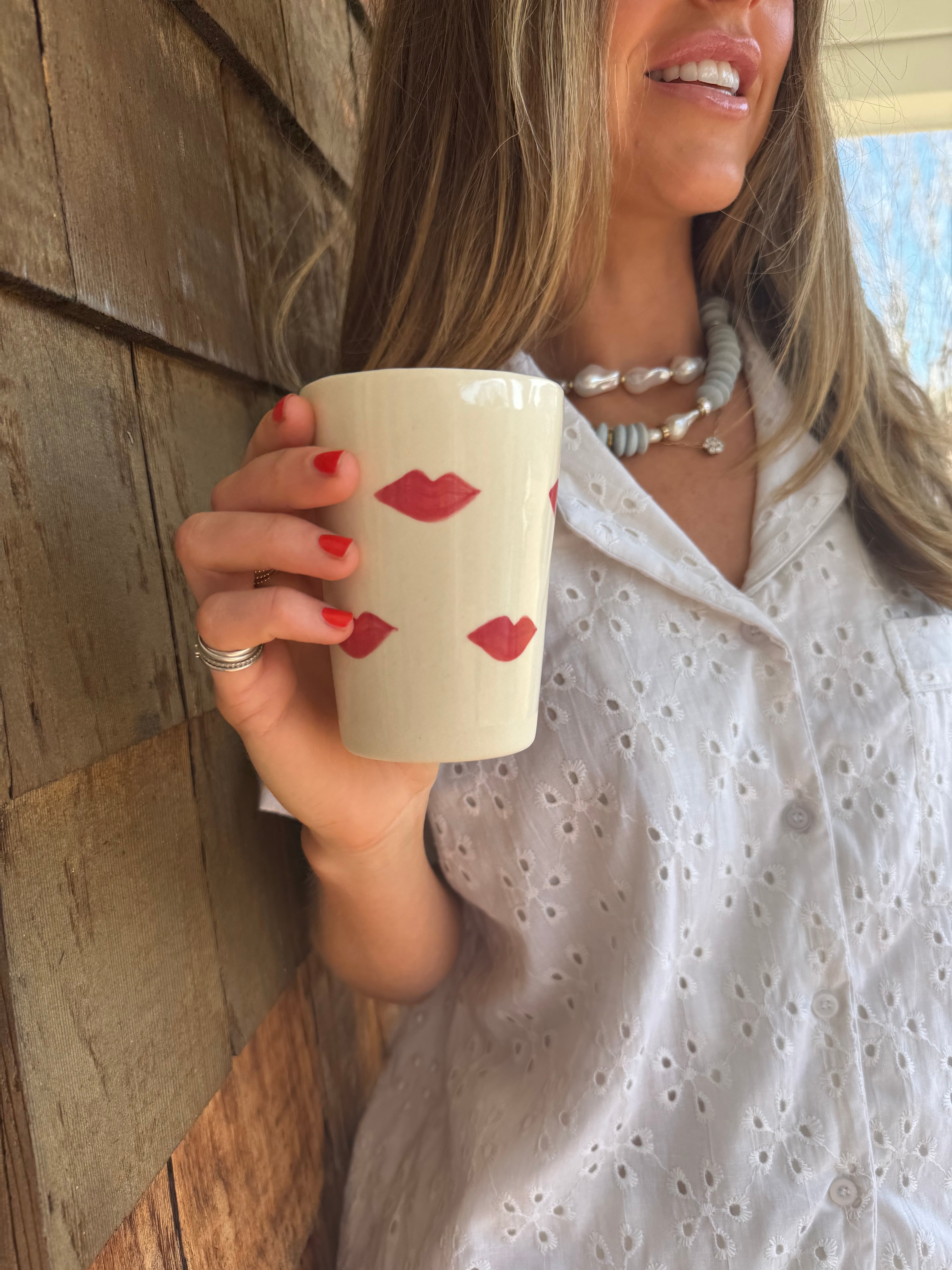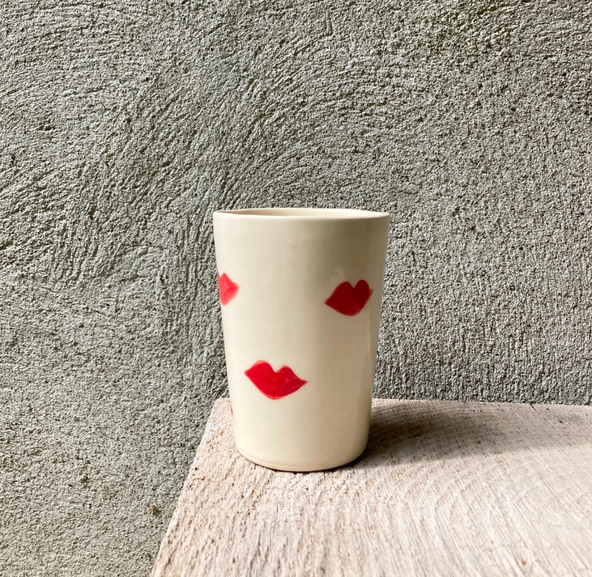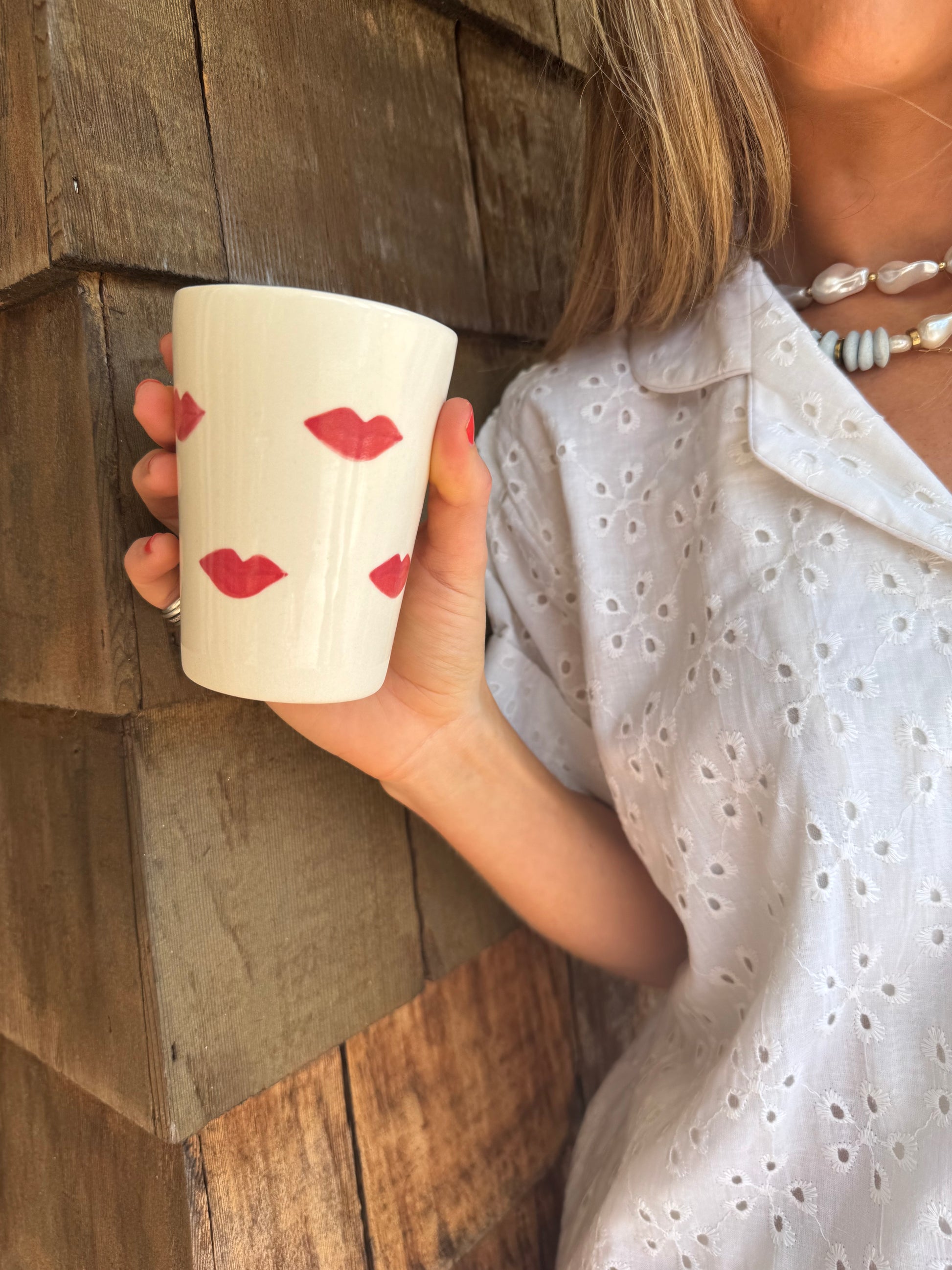 Rich dover white and hand painted with vibrant red lips. Each cup is unique.